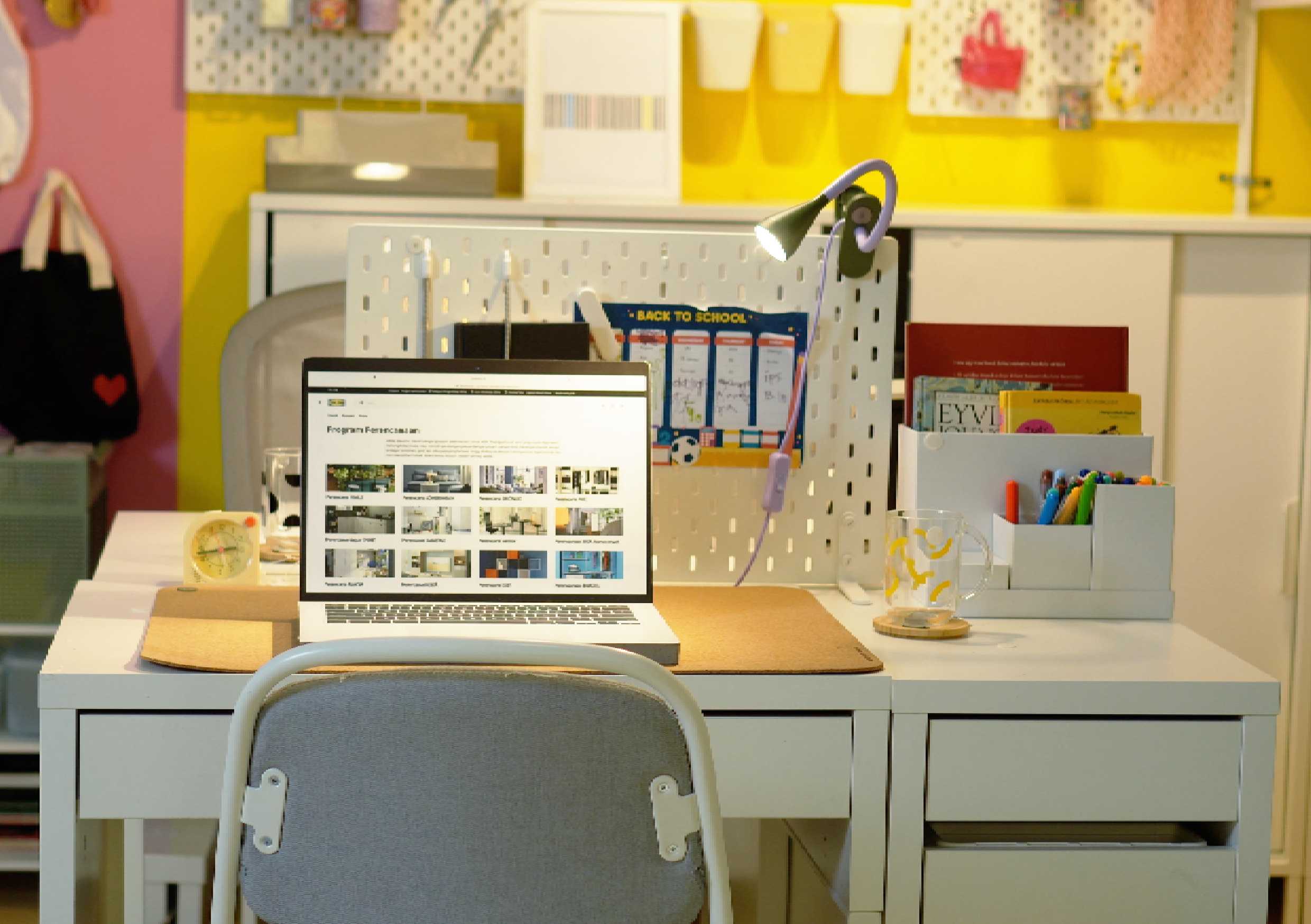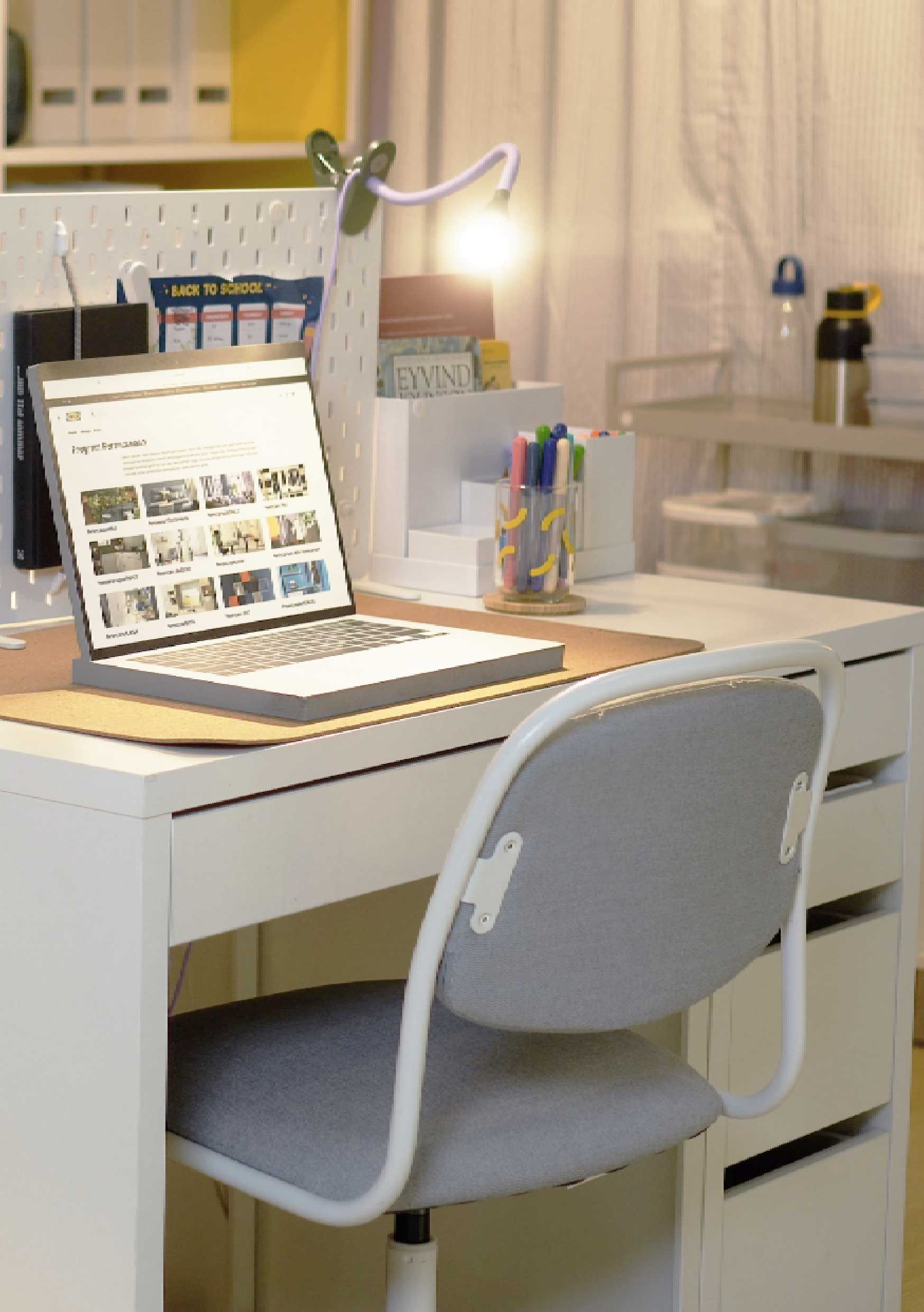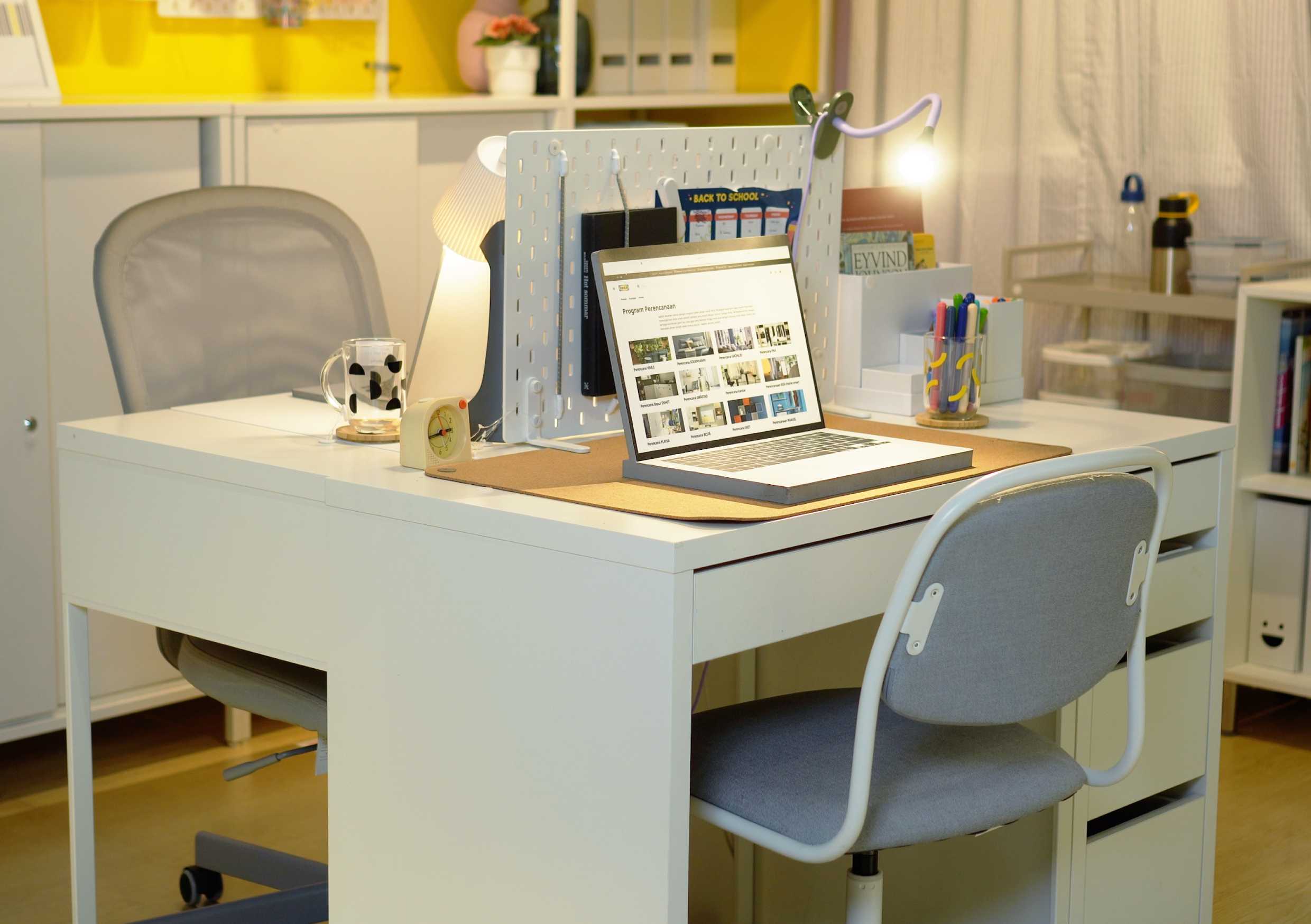 Arul, an interior designer, designed a 12m2 room into a study area for siblings. While not particularly large, it proved to be more than enough to create a functional study space, using MICKE series of desk, which feature the same height but vary in size.