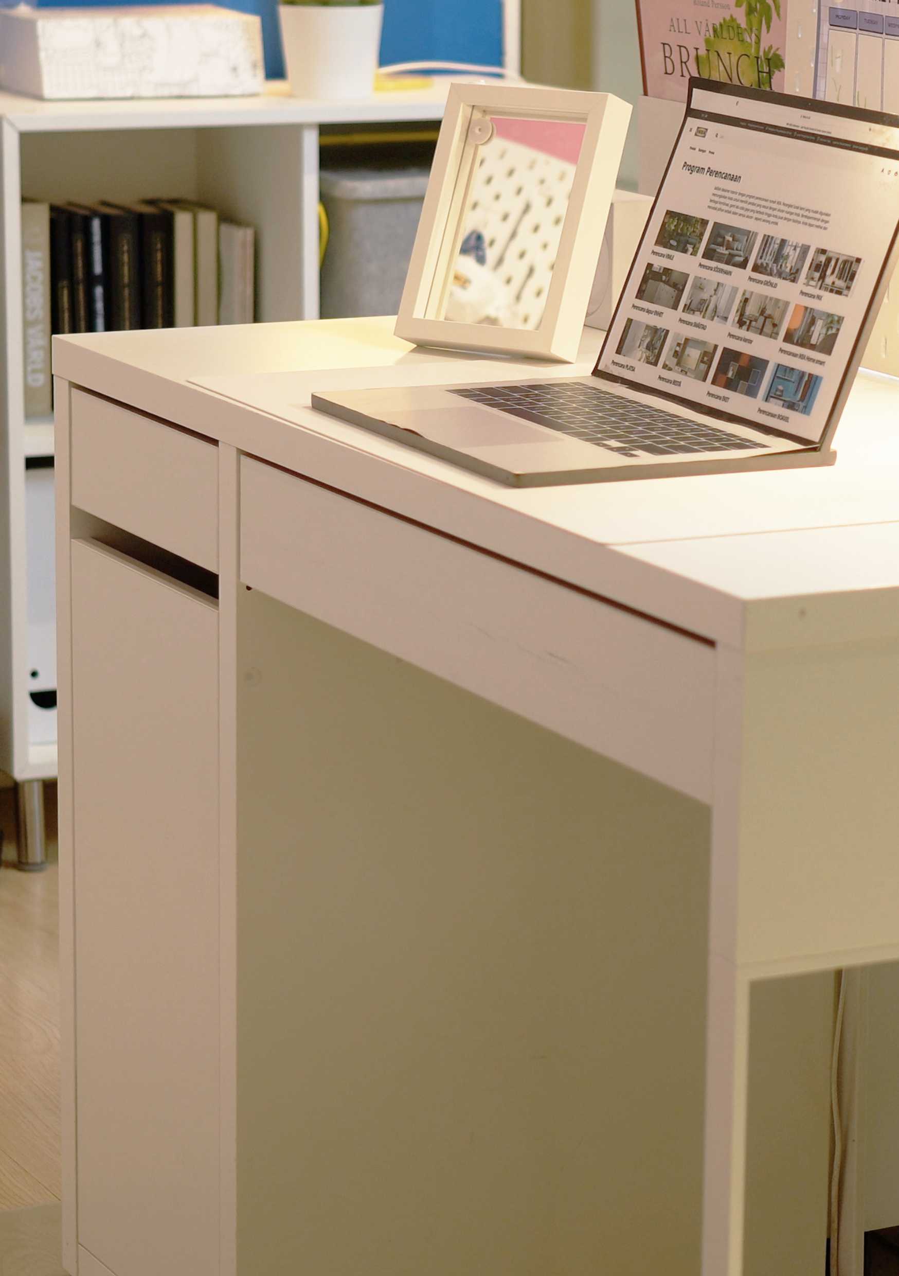 The older sibling uses a 105x50 cm MICKE desk. It has a clean and simple look that fits just about anywhere, and features drawer unit that can be mount the storage unit to the right or left, according to your space or preference. The drawer unit also features a stopper to prevent the drawer from falling when pulled out too far. Cables and power outlets can be hidden in a cable routing path at the back of the desk.
