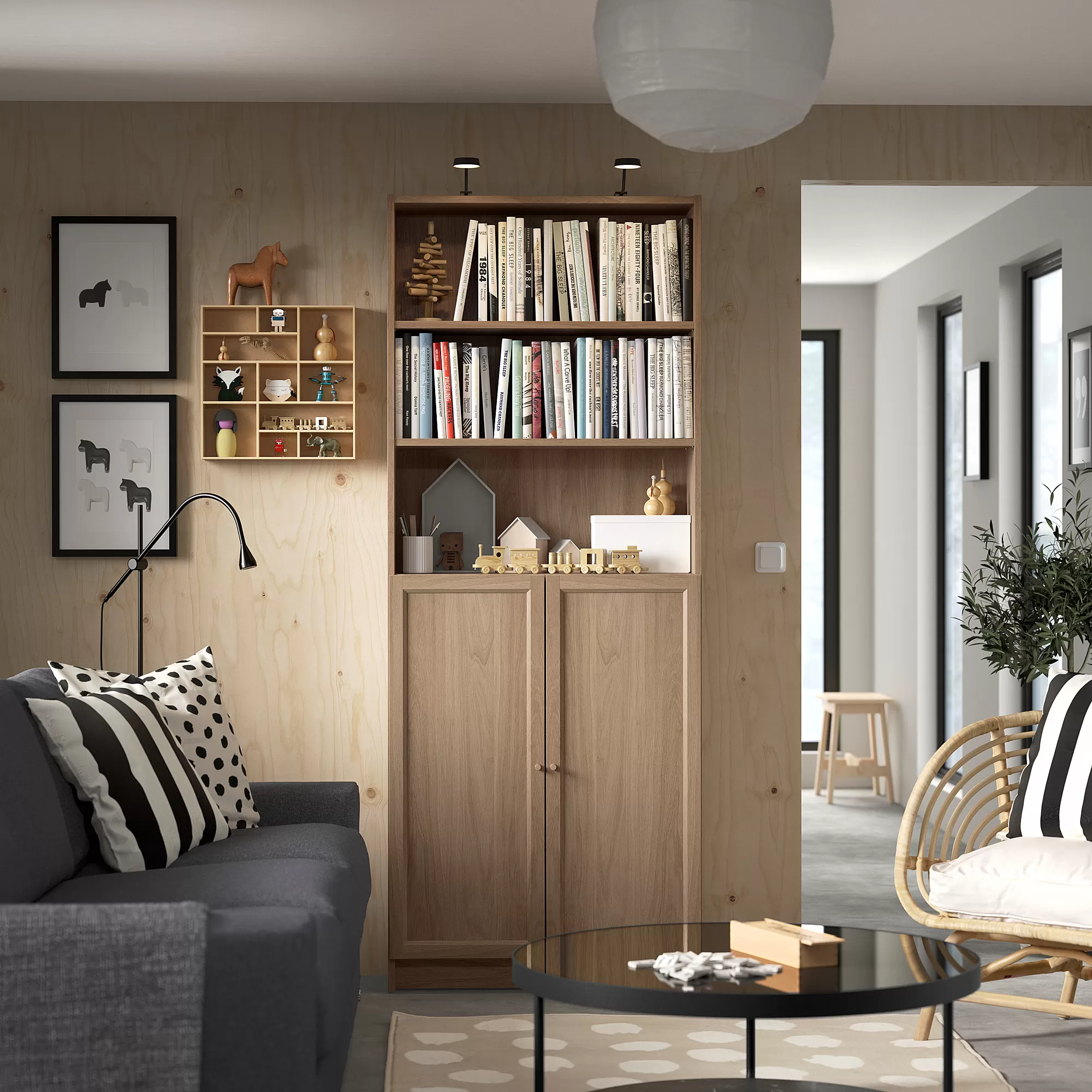 BILLY bookcase is a beloved icon that, thanks to its versatility, can be used in many ways. This solution with OXBERG panel doors has closed and open storage – suitable for living room and dining areas.