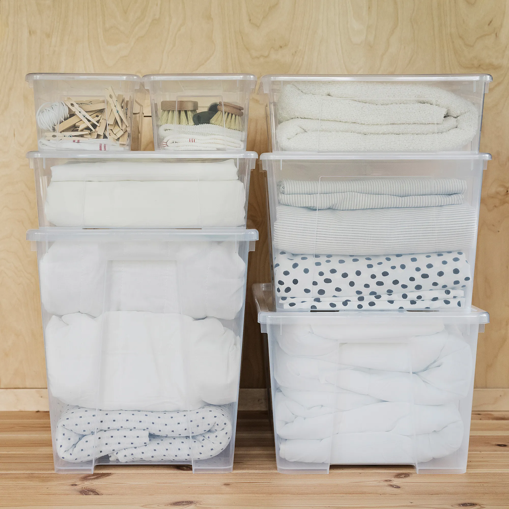 This mid-size box is perfect for storing everything from seasonal decorations to sports gear. The transparent plastic reveals the contents inside so you can easily find what you are looking for.