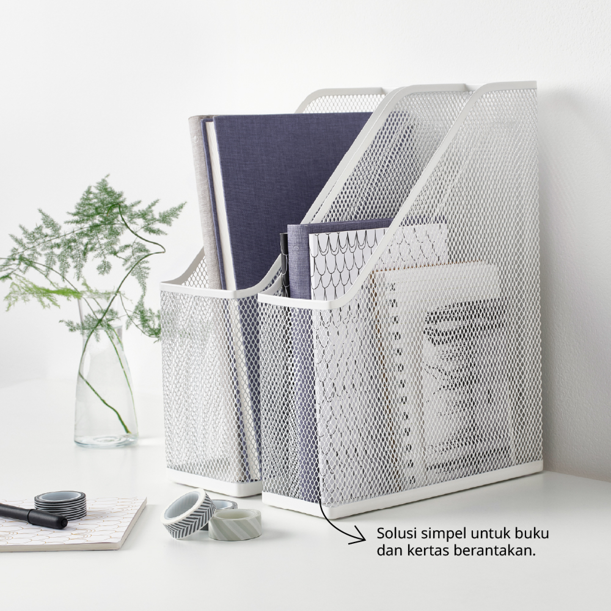 Atur kertas, resep, dan majalah yang cenderung berserakan di sekitar rumah Anda. Penyimpanan jaring logam putih ini ringan dan menghemat waktu karena Anda dapat dengan cepat melihat apa isinya.
