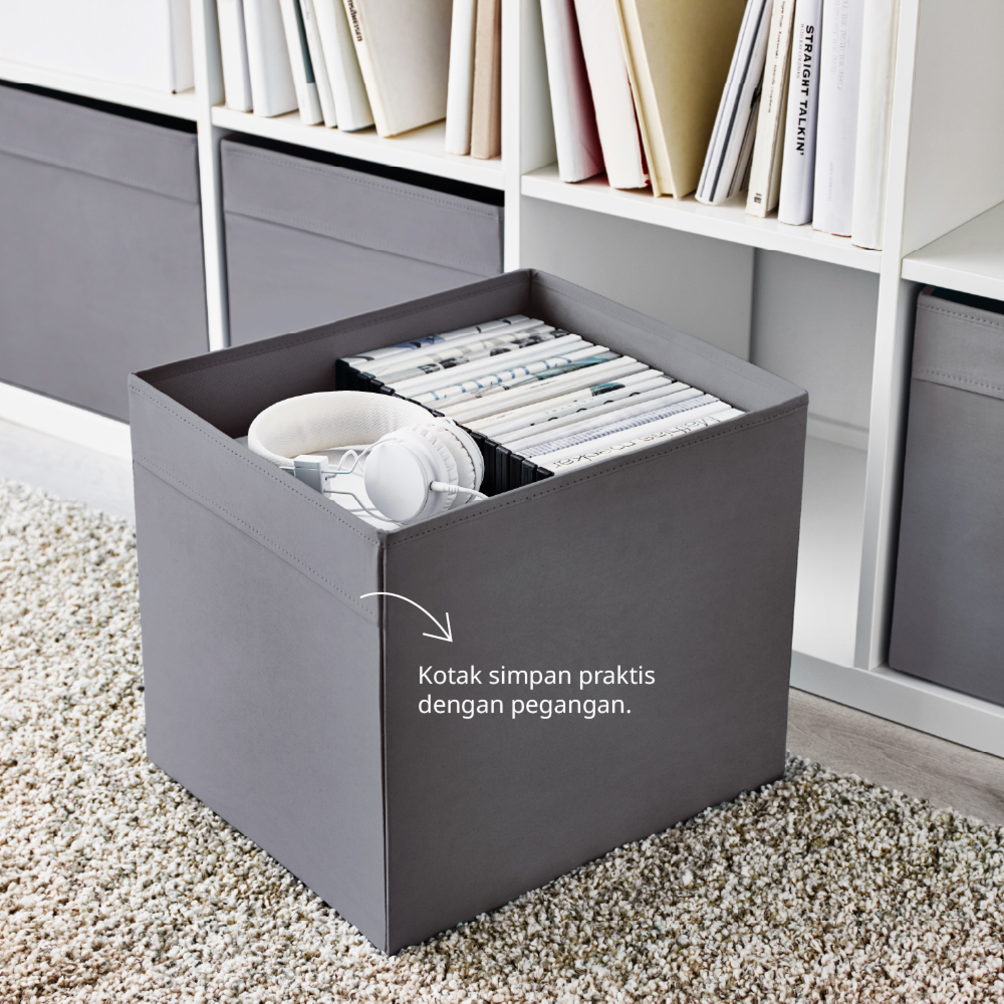 Kotak penyimpanan berbahan kain ini menambah gaya dan fungsi - terlepas dari apakah itu di rak buku atau di dalam lemari. Berdimensi untuk unit rak KALLAX dan terbuat dari sebagian besar poliester daur ulang.