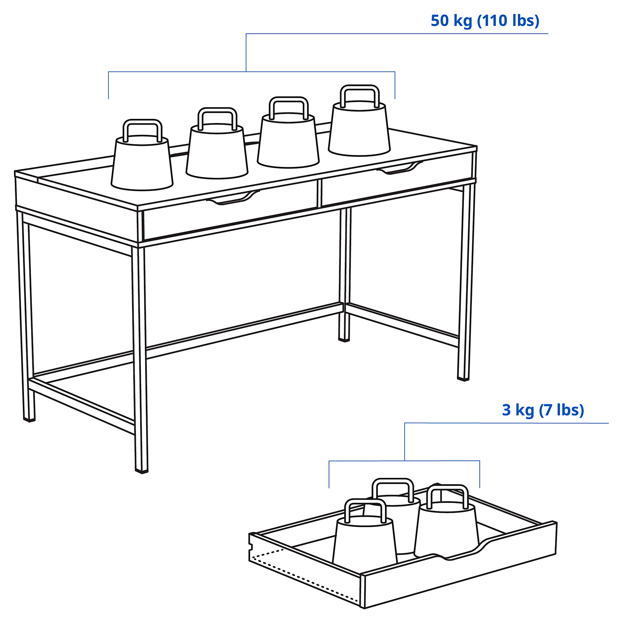Meja ini telah diuji untuk penggunaan rumah tangga dan memenuhi persyaratan untuk daya tahan dan stabilitas yang ditetapkan dalam standar berikut: EN 12521 dan EN 1730.