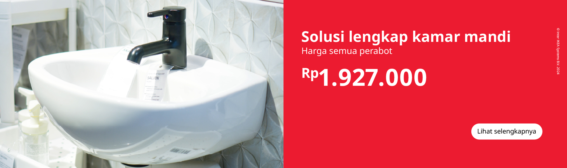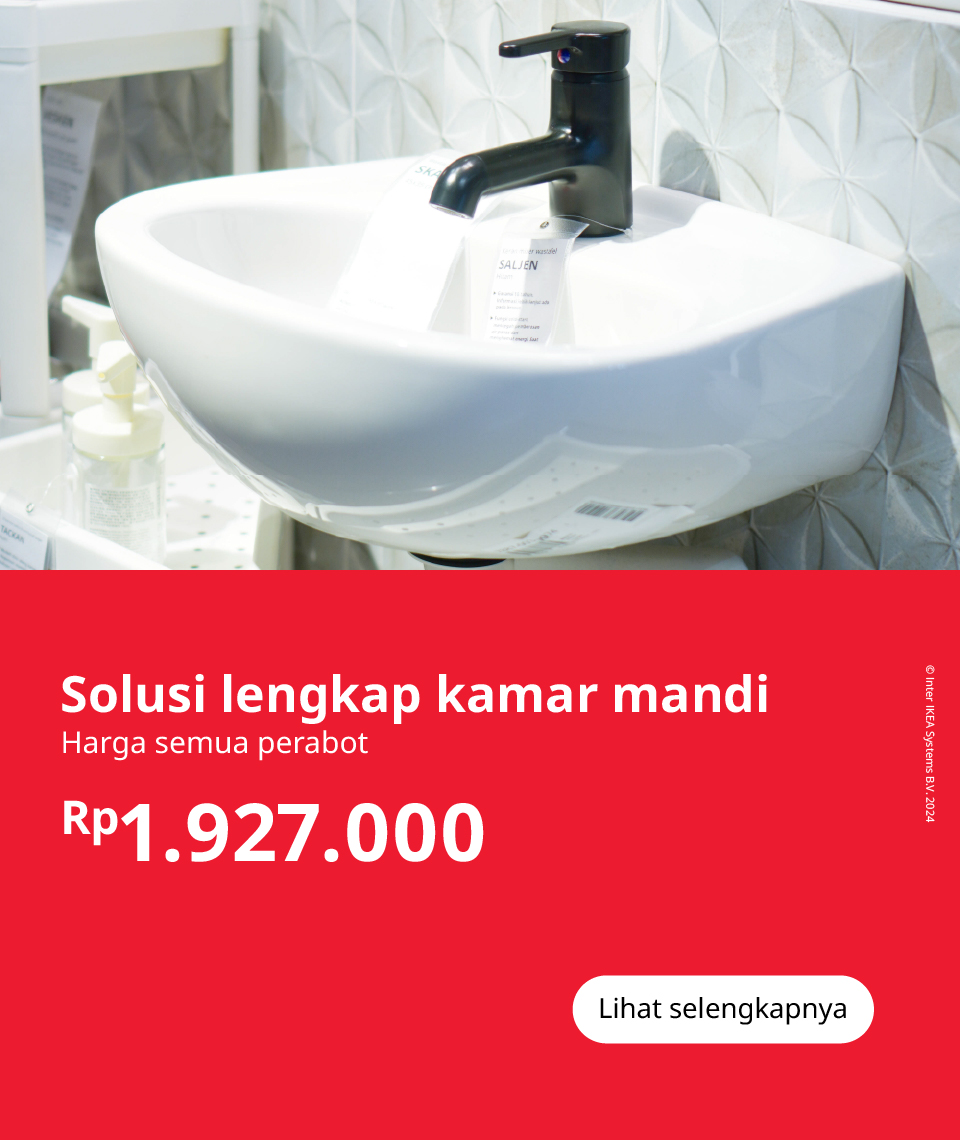 Rutinitas kamar mandi berukuran kecil ini terasa ramai, namun tetap teratur. Penggunaan 'dinding cermin' pada kamar mandi berukuran kecil akan membuatnya terlihat lebih luas, dan juga akan memungkinkan banyak orang untuk bersiap-siap di pagi hari pada waktu yang bersamaan. Bangku tangga dapat membantu anak Anda untuk bercermin dan bersiap bersama. Gunakan beberapa jenis plastik hisap untuk menampung berbagai perlengkapan kamar mandi anak-anak Anda. Ketika mereka tumbuh, Anda juga bisa mengubah ketinggian letak TISKEN. Dengan bantuan tempat penyimpanan gantung NORDRANA, Anda dapat menyimpan buku dan mainan anak-anak Anda untuk menghibur ketika mereka mandi. Atau gunakan ENEBY Speaker Bluetooth® untuk bernyanyi bersama di kamar mandi!